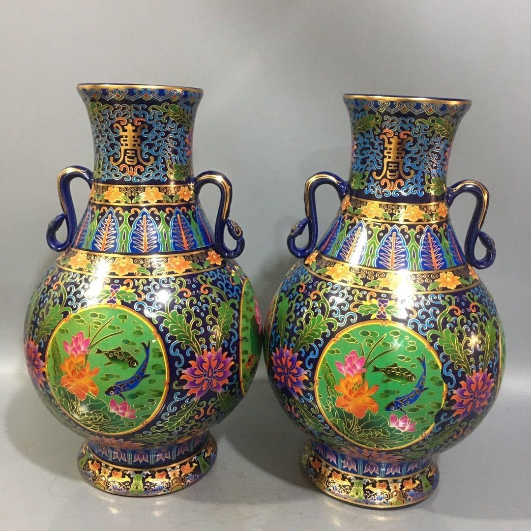 - 【伝世蔵品】中国古美術 古玩 唐物旧蔵 大清乾隆 御製 琺瑯彩絵双耳瓶ペア 極細工 置物 擺件 古賞物 風水物 鎮宅 骨董品 中国骨董