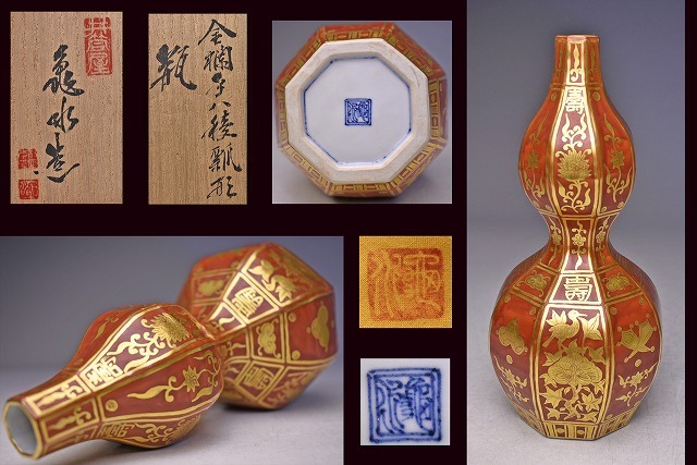 > 村田亀水 ★ 金襴手八稜瓢形瓶 ★ 共箱共布 ★ 上作 ★ 徳利 一輪挿し 花入に ★ 京焼 清水焼 名工 ★ 赤絵金彩瓢瓶