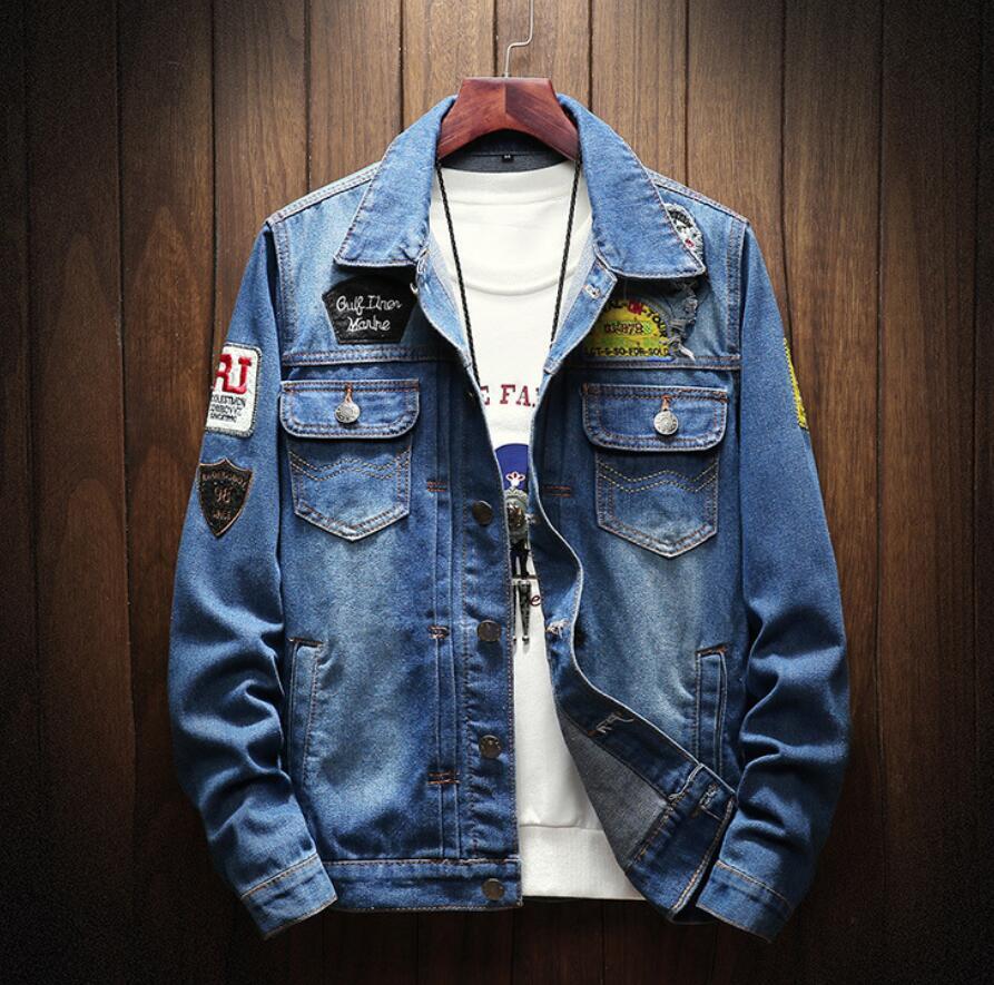 - 新入荷 / 新品 デニムジャケット メンズ ジージャン ユーズド加工 ダメージ 紳士 アウター ワッペン付き アメカジ / ブルー