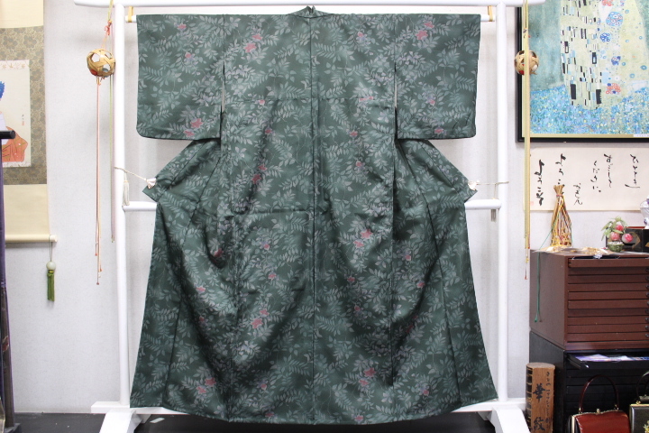 > きもの今昔6683 合繊きもの バチ衿単衣仕立てきもの 濁りグリーン地色クレマチスの花 身幅ゆったり 身丈159cm