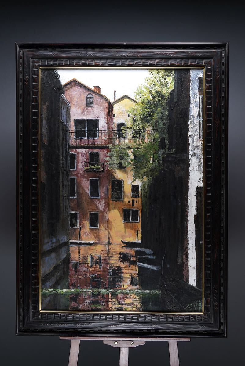 - 真作保証 西山喬「朝の水路」油絵 画寸(61cmx91cm) サイン・シールあり 2003年制作 状態良好!イタリア ヴェネツィア風景 高級額縁付大作