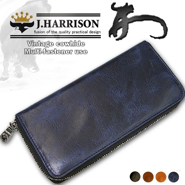 - J.HARRISON ジョンハリソン 牛革 ビンテージ風 ラウンドファスナー大容量 長財布 JWT-018 BL (32) 新品