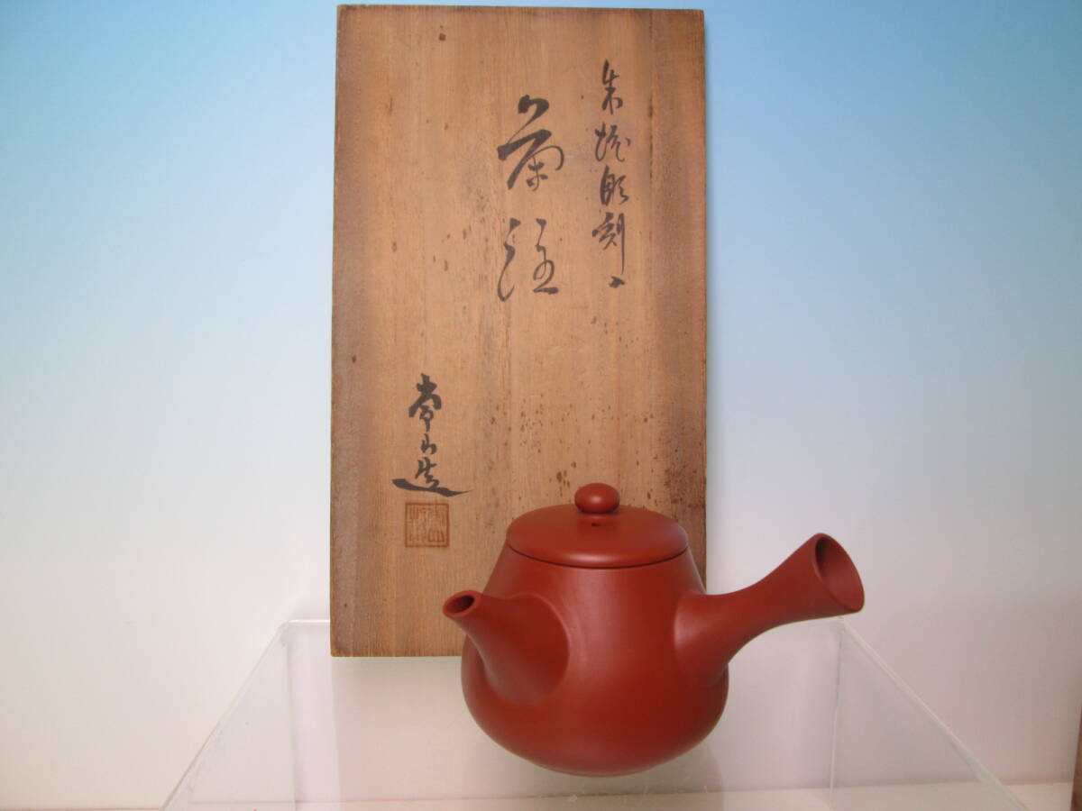 - ☆人間国宝 三代 山田常山 常滑 朱泥 細密文字 漢詩彫刻入 茶注 共箱 一客のみ