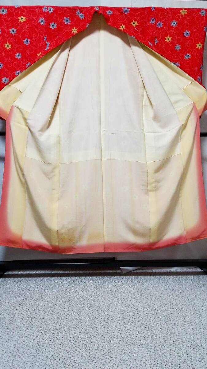 > 【桐徳】小紋☆赤地*2色花とつる草文様*リメイク*細工用{正絹*袷.小紋}*身丈154-裄64*赤地*2色花とつる草*訳有品*№6471
