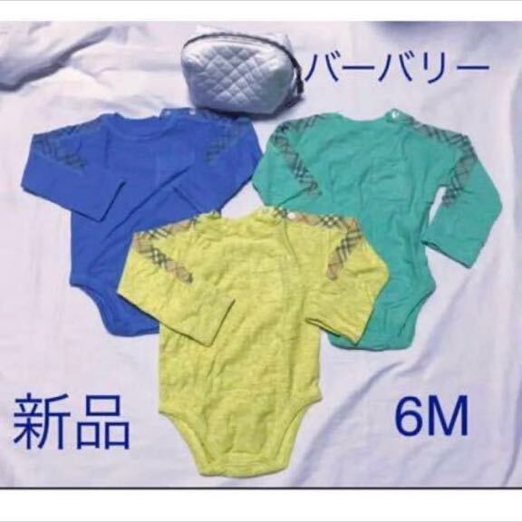- w 新品バーバリー ノバチェック ロンパース 3枚 ポーチ付6M ミトンになる袖口 ユニセックス 送料無料