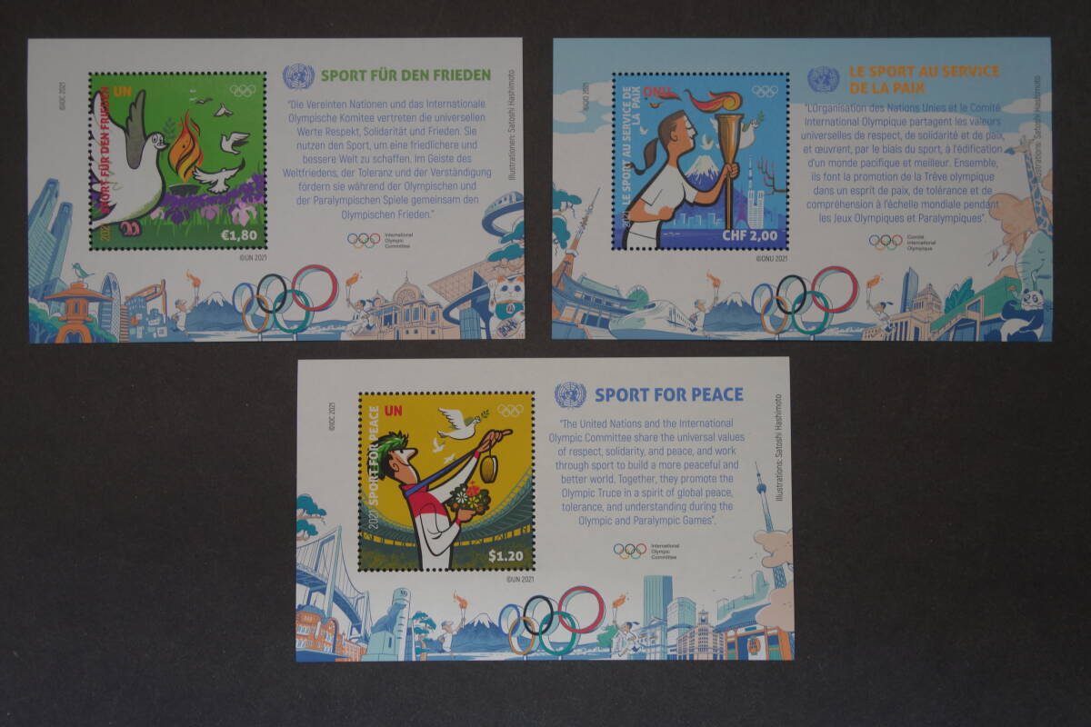- 外国切手: 国連切手「東京2020オリンピック競技大会」(ウィーン事務局、ジュネーブ事務局、本部) 小型シート 3種 未使用