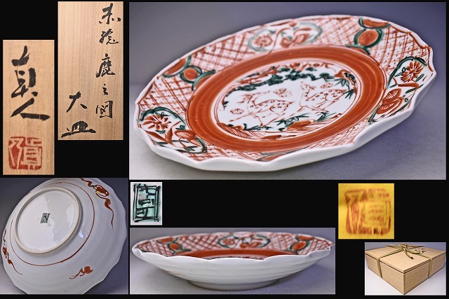 > 村田真人 ★ 赤絵鹿之図大皿 ★ 共箱共布 ★ 鮮やかな 呉須赤絵 赤呉須 ★ 村田亀水 村田陶苑 薫陶受ける ★ 村田眞人 ★ 京焼 清水焼 ★