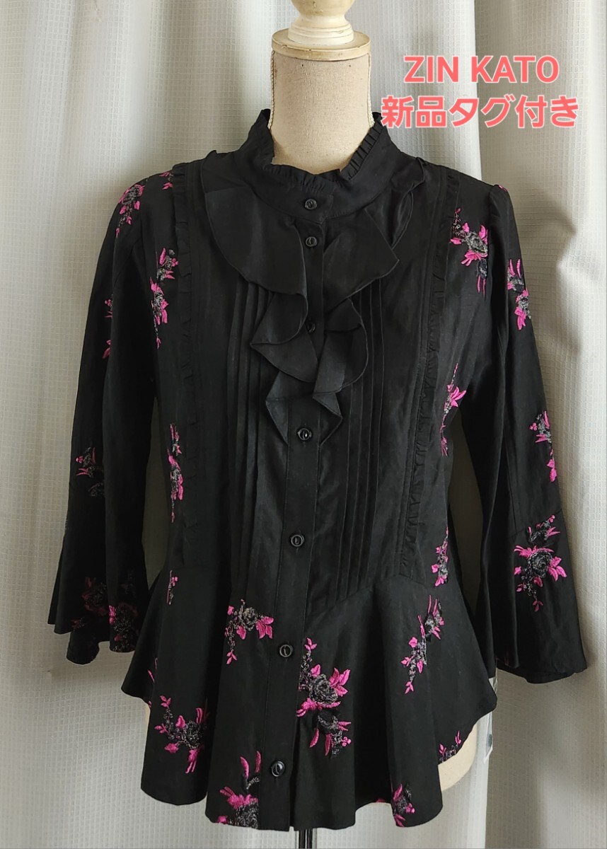 - 未使用タグ付き ZIN KATO 綺麗な刺繍ブラウス 黒 長袖