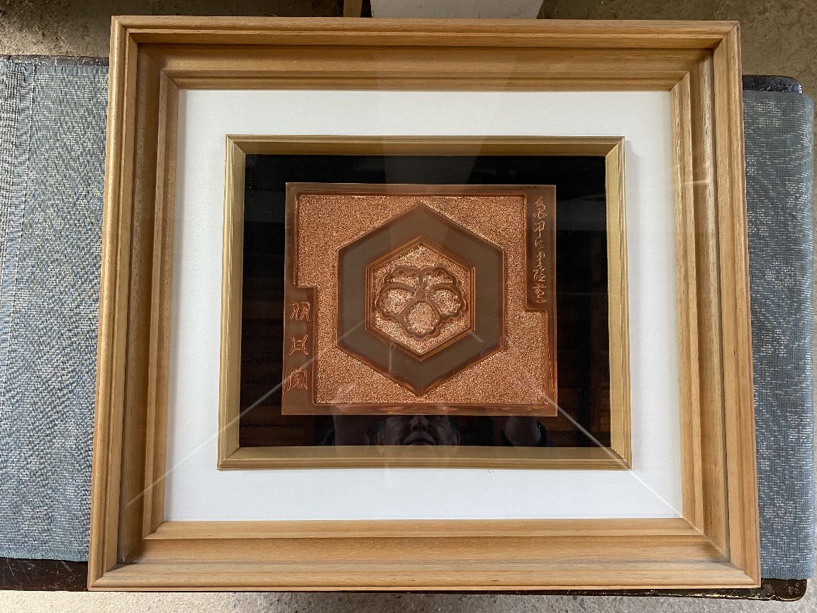 - 家紋額 銅製 立体 家紋「亀甲に蔦紋」銘有 ガラス額装品▼銅総削り出し家紋