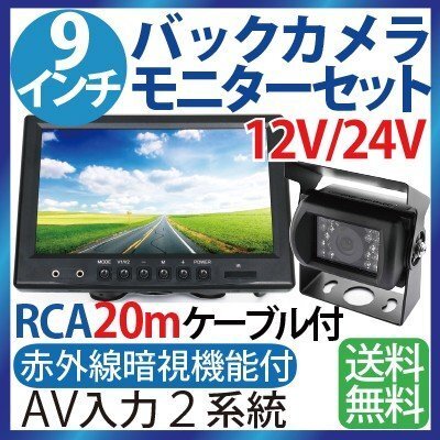 - 9インチ液晶バックカメラ モニター セット 12V/24V兼用 RCA汎用 ケーブル20m付き乗用車,赤外線暗視機能付 9rca