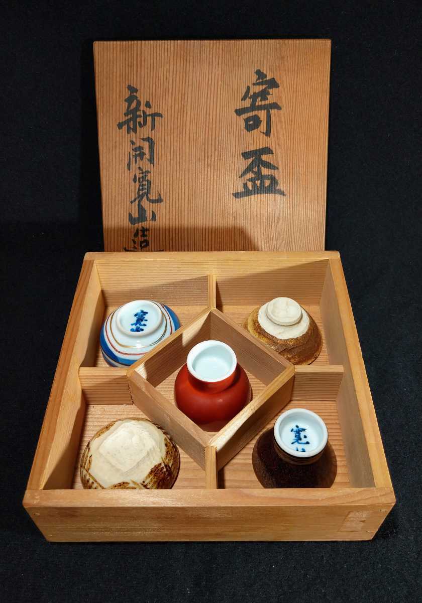 > 新開寛山 「寄盃」 酒盃 5種5客組 共箱 ぐい呑 酒器 日展理事 京焼 師:清風与平/清水六兵衛 b-02i126