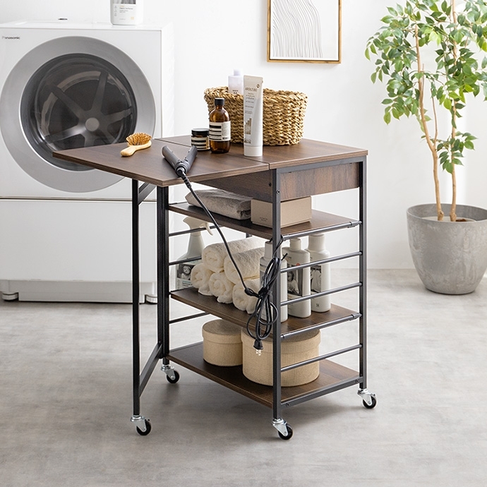 - バタフライキッチンワゴン 引出付き キャスター付き 伸縮式キッチンワゴン 【幅36~69cm】 ブラウン色