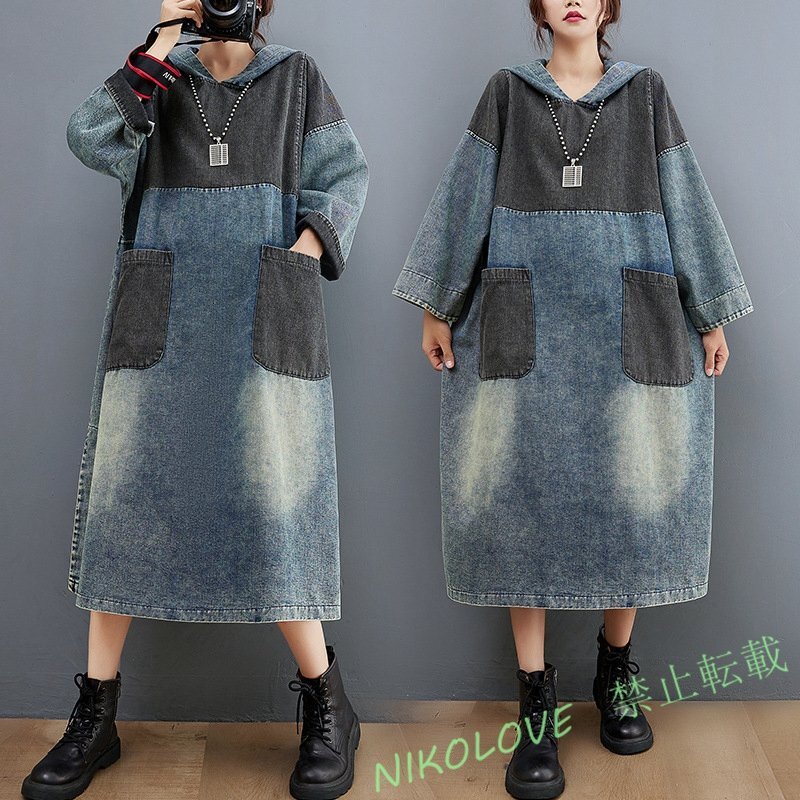 - ~4L5L ツートン切替USED加工パーカーデニムワンピース ネイビー系 LC920