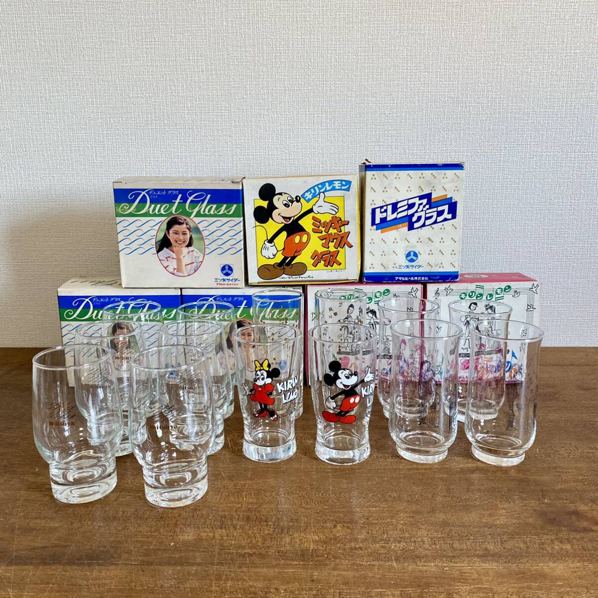 - 【デッドストック】 昭和レトロ ノベルティ グラス 14点セット / 三ツ矢サイダー キリンレモン ミッキー 箱入り 未使用品