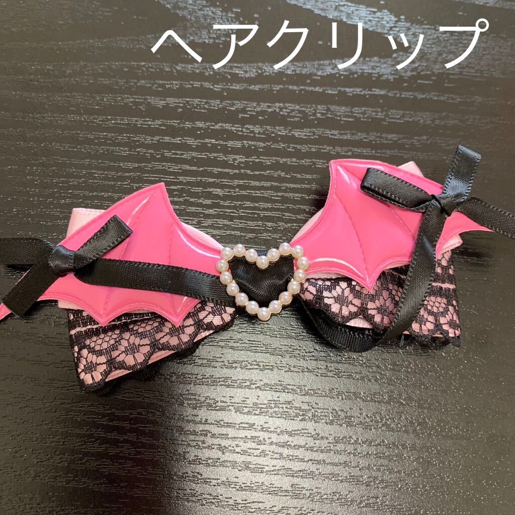 - 地雷系 デビル 羽 フェイクパール ブラック×ピンク リボン ヘアクリップ