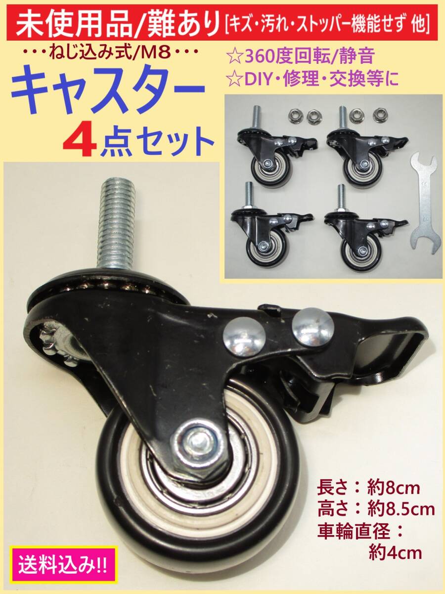 - 難あり 未使用 ねじ込み式 キャスター 4点セット B ストッパー不備 キズ M8 ネジ径 8mm 360度 回転 静音 車輪 径 4cm 交換 修理 DIY 海外製