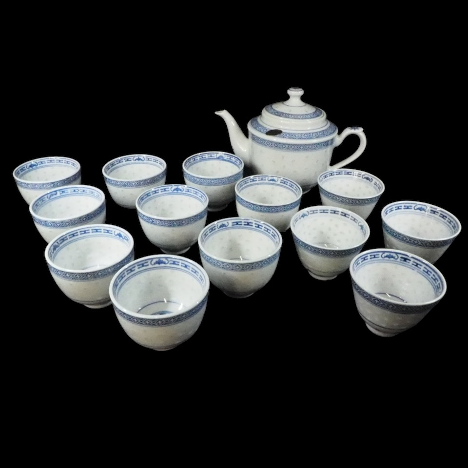 - 中国古玩 景徳鎮製 青花・蛍手菊紋の煎茶器セット「蛍焼 青花透かし 急須 煎茶碗13客」1990年代 煎茶器 茶器セット 茶器 食器 SHI605