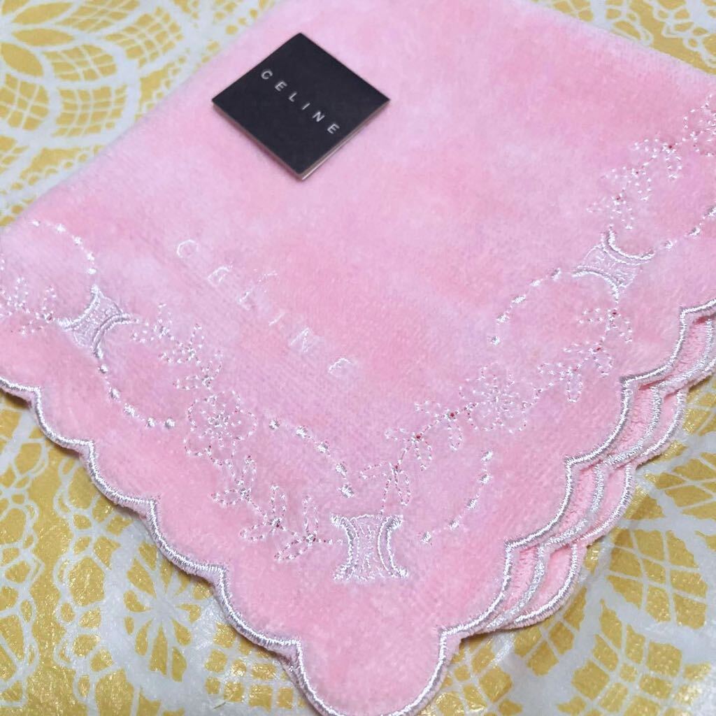 - 【レア】新品/CELINE/タオルハンカチ/正規品/セリーヌ/綿100%/未使用ブランド/ハンドタオル/マカダム柄/ピンク刺繍/レディース/花柄/女性用