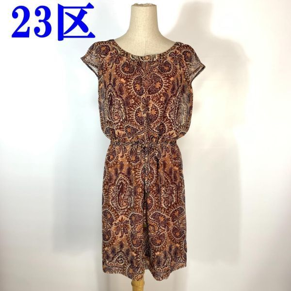 - 23区 ひざ丈ワンピース 総柄 裏地有 ウエスト絞り 茶色 ブラウン フレンチスリーブ オーバーサイズ ドルマンスリーブ 36 C9904