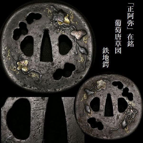 > 【 恵 #1155 】 「正阿弥」在銘 見栄え良き葡萄唐草図 鉄地鍔 金象嵌色絵 検:鍔/縁頭/切羽/ハバキ/刀剣/刀装具