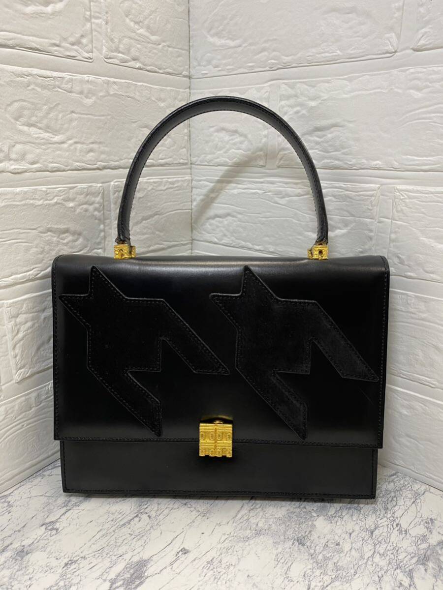 > 美品 オールド セリーヌ CELINE レザー クラシック ハンドバッグ 凱旋門金具 千鳥格子柄 グレンチェック ヴィンテージ ブラック×ゴールド