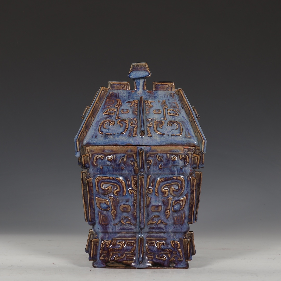 - 旧藏 鈞窯紫紅釉 獣面文方尊 唐物 箱付き 陶磁器 中国美術 工芸品 置物 賞物 RG30