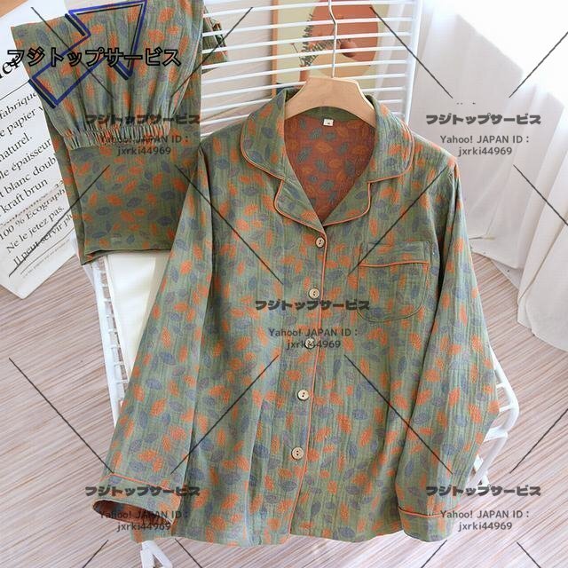 - パジャマ ガーゼパジャマ 二重 レディース ルームウェア 綿100%ガーゼ 長ズボン 上下セット 敏感肌用 部屋着 春夏秋冬 イエロー L