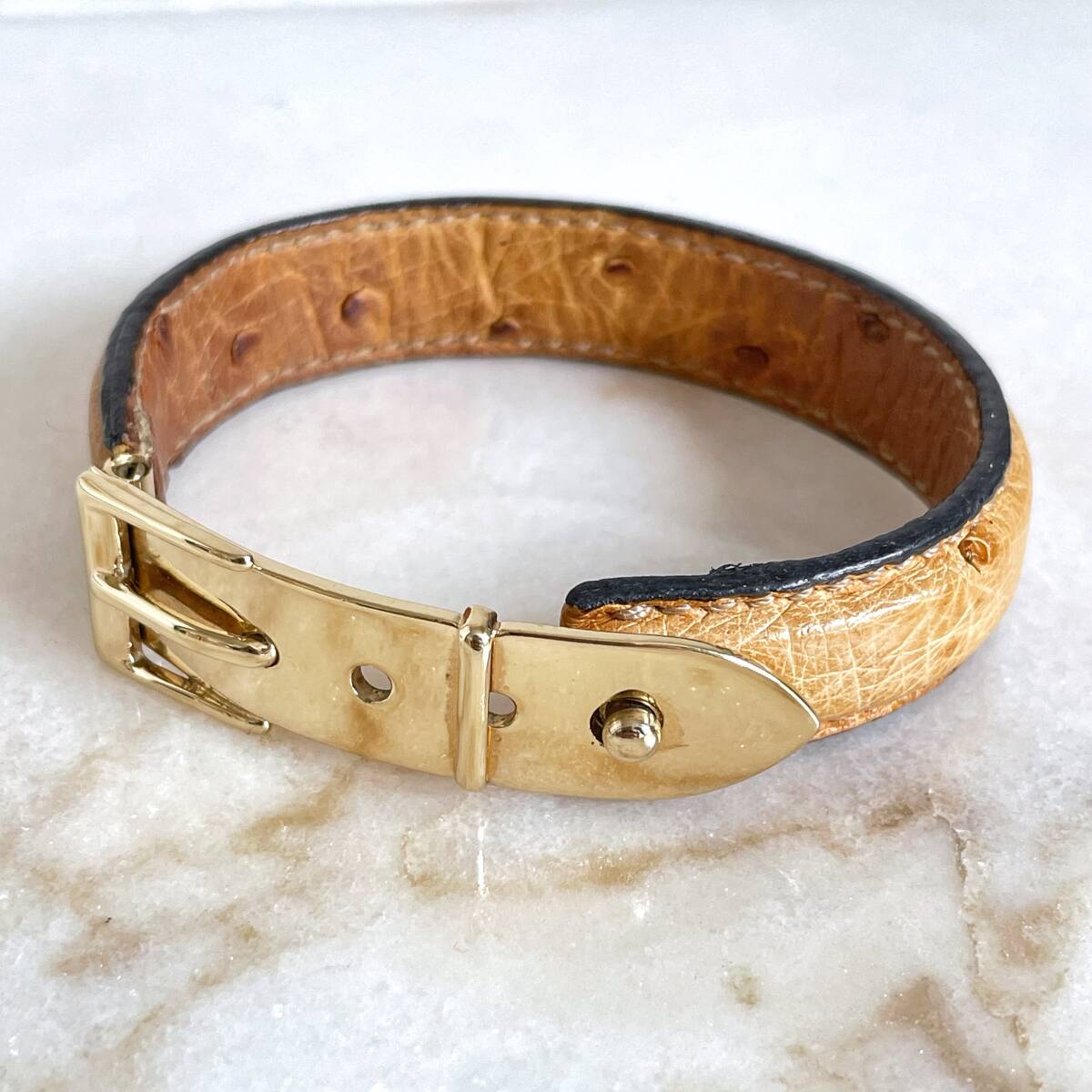 - GUCCI グッチ オーストリッチ レザー・バングル ブレスレット 茶×ゴールド