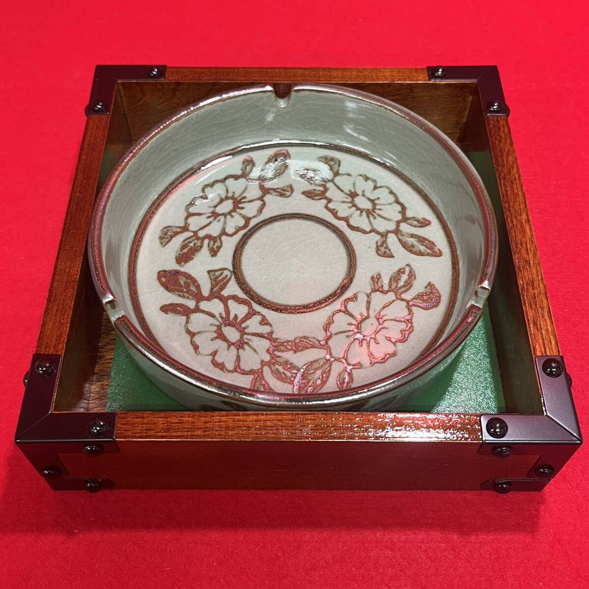 ☆未使用☆ 欅 灰皿盆 青磁 花草文 灰皿 天然木 けやき 莨盆 工芸品 古道具 美品 (06076E