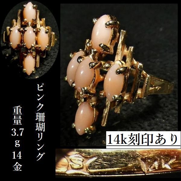 【 恵 #1105 】 重量 約 3.7g 14金刻印あり ピンク珊瑚リング ゴールドリング拍卖
