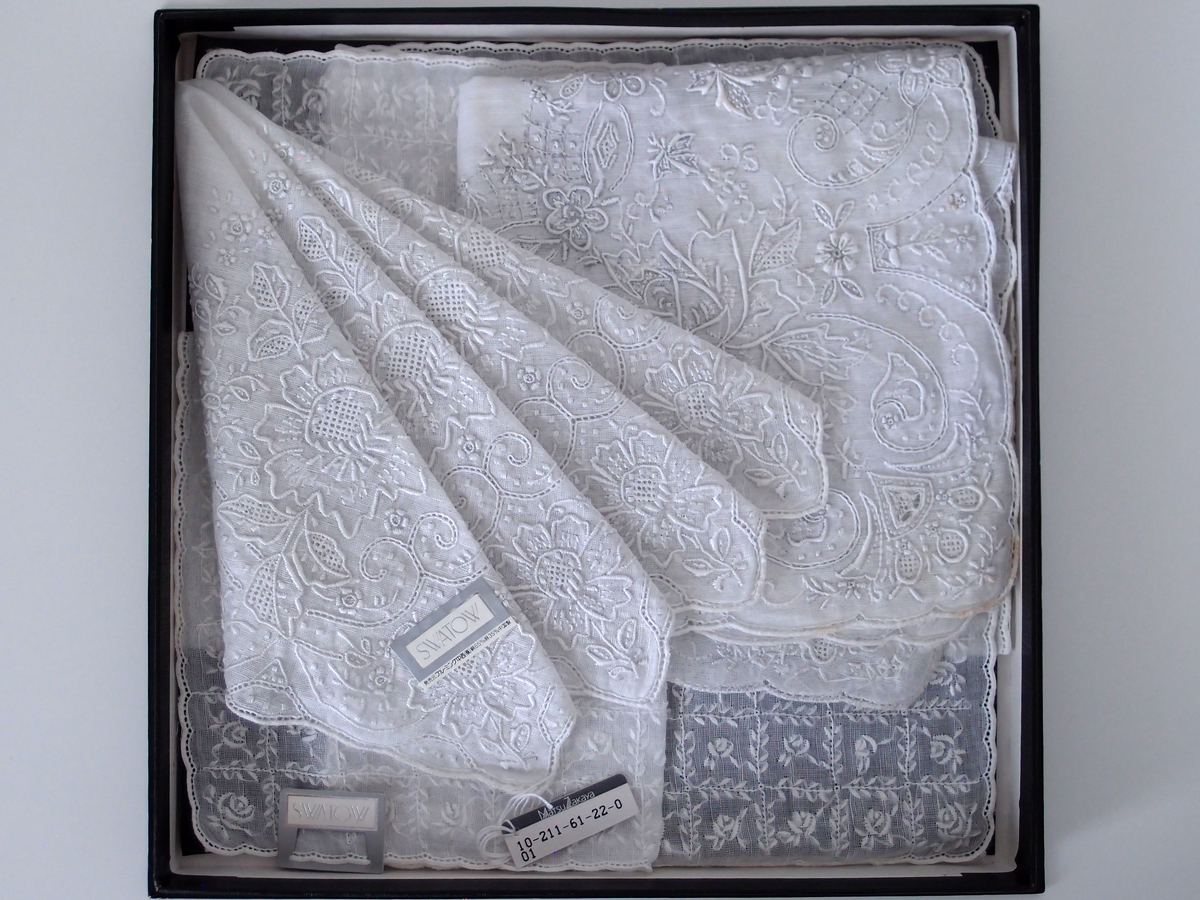 - ●SWATOW 刺繍ハンカチ 箱入り3枚セット 未使用●中国製 手刺繍 ハンカチーフ スワトウ 汕頭 長期保管品