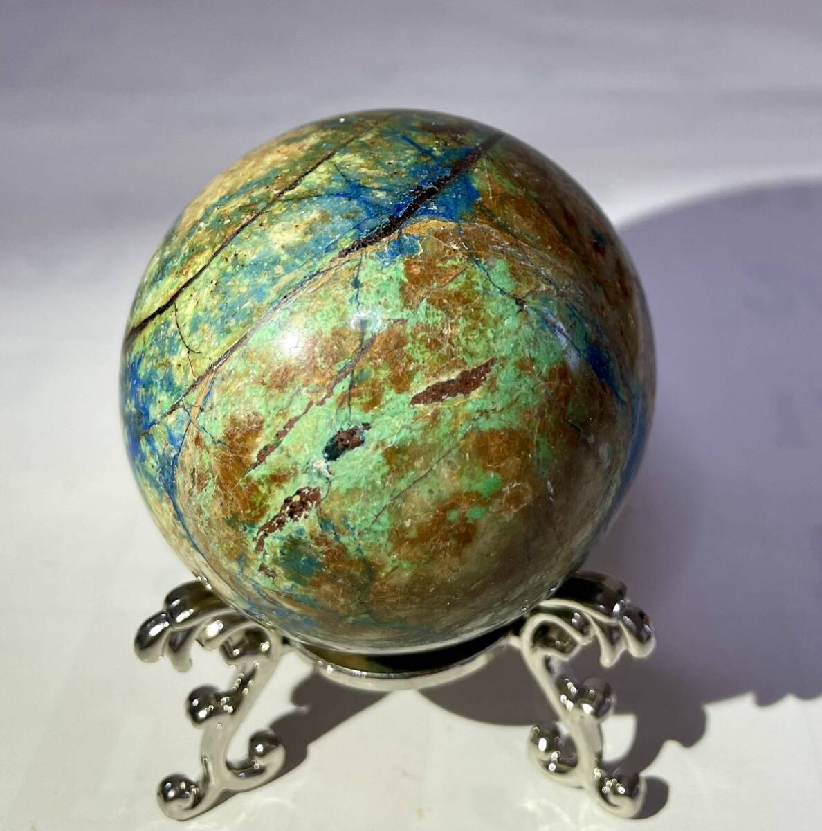 > アズライト クリソコラ 008 丸玉 天然石スフィア パワーストーン 魔除 お守 地球模様 幸運 ラッキー 風水晶 置物インテリア エネルギー