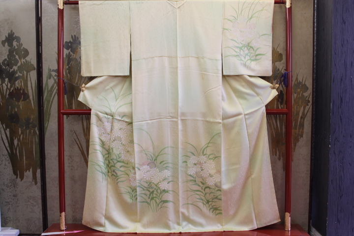 - きもの今昔7172 付け下げ訪問着 広衿袷手縫い仕立 正絹綸子地クリームと若草色ボカシ地 緑の草と白花 身丈153CM
