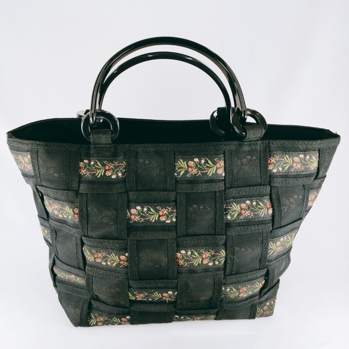 - 【レトロ】ハンドバッグ 手提げ 花柄 チェック ブラック系 通勤通学 鞄 かばん カバン ハンド スクエア トート 軽量 ヴィンテージ E-4