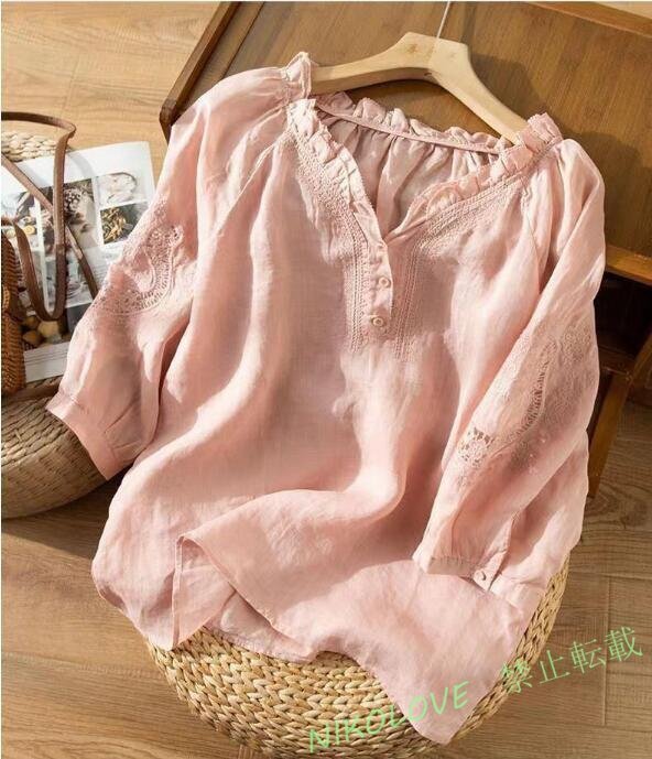 - 新品長袖上品ブラウス レディース 七分袖 チュニック 刺繍り 綿麻 シャツ ゆったり 可愛い 大人 トップス ピンクMサイズ選択可 LC601