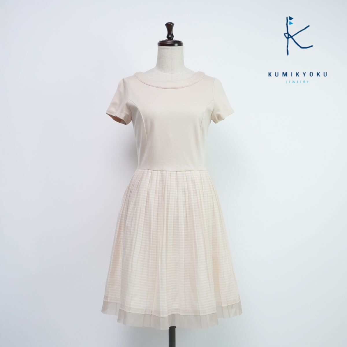 > 美品 組曲 クミキョク ドッキング プリーツフレアワンピース 膝丈 裏地あり レディース ベージュ サイズ2*QC347