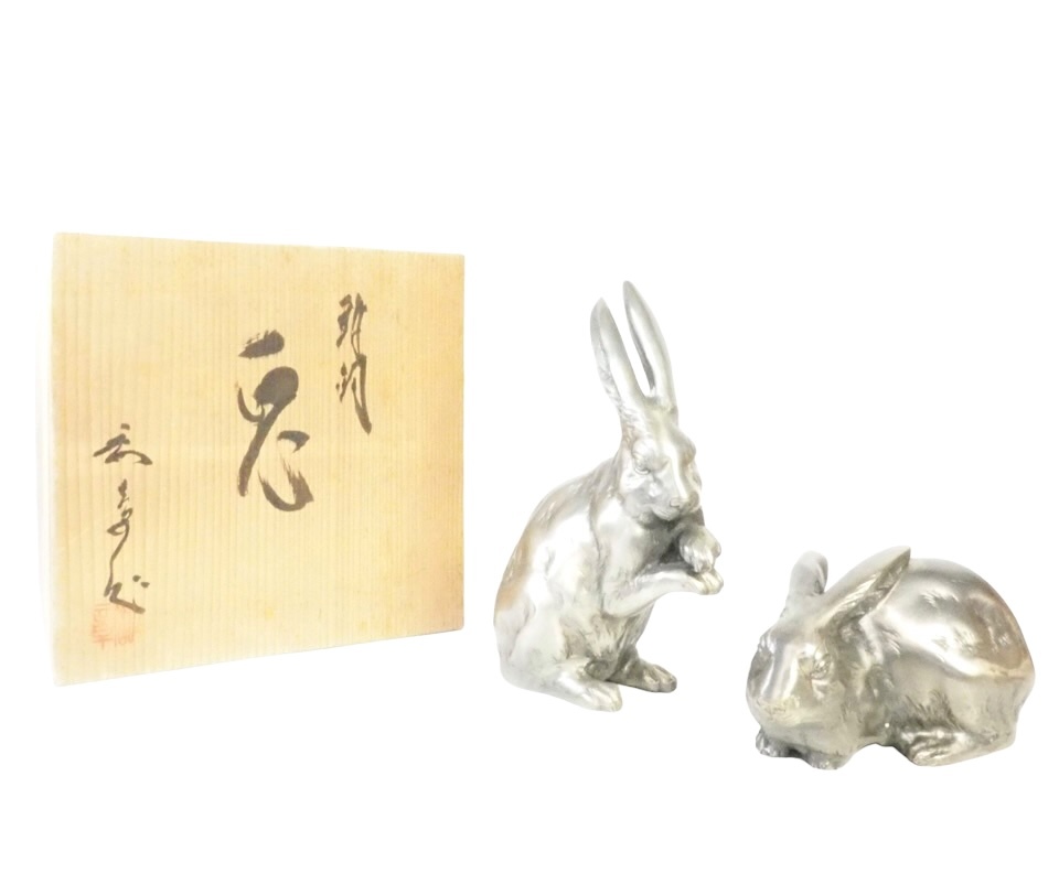 - 昭和ビンテージ 金属製「新月 兎」二体 置物 在銘あり 共箱付 1974年製 TKA606