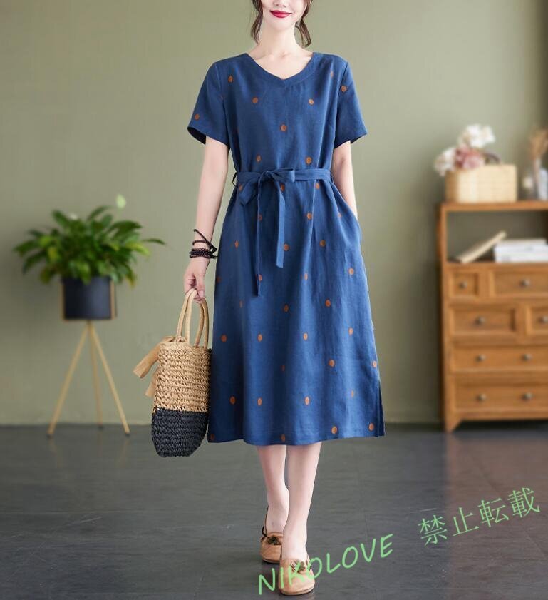 - 新品 夏ロングワンピース カジュアル ゆったり リネンワンピース 夏 半袖 上品 きれいめ ドット柄 着痩せ マキシワンピースネイビー LG950