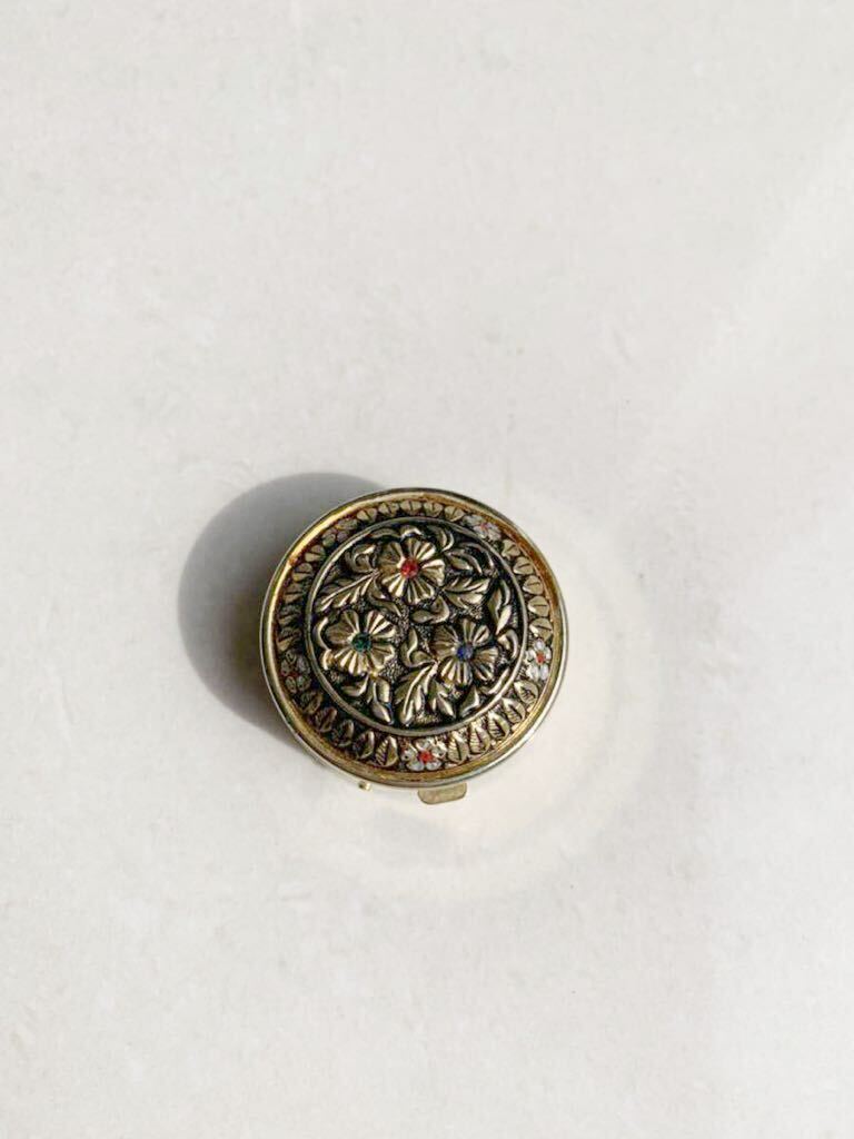 - 【美品】イギリス購入 ヴィンテージ ピルケース お花 小物入れ ゴールドトーン カラービジュー ダマスキナード風
