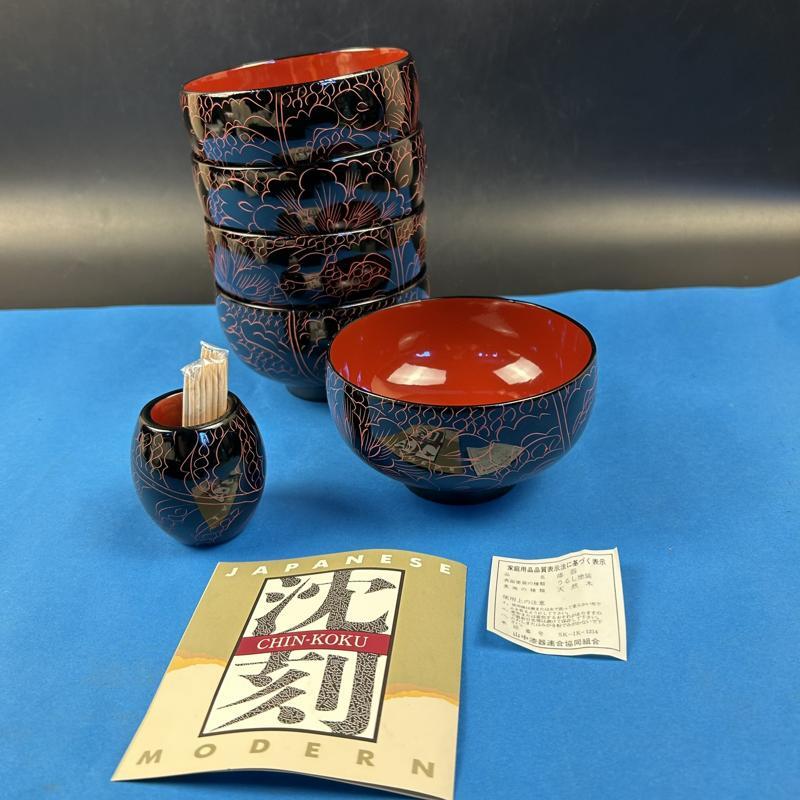 - ks571 汁椀揃 5個セット 大黒汁椀 本うるし塗 和食器 楊子入付 沈朱 未使用・保管品