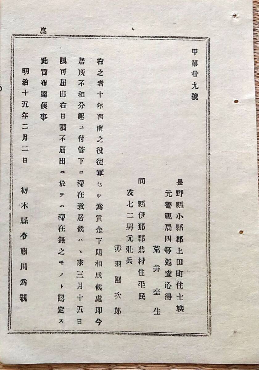 - f24071002〇明治布告布達 西南の役従軍 栃木県 明治15年〇和本古書古文書