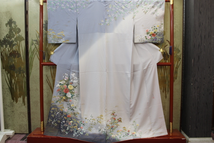 > きもの今昔7271 訪問着 正絹一越地 染と刺繍で豪華 花籠に四季の花 グレー濃淡天地ボカシ 身丈160CM