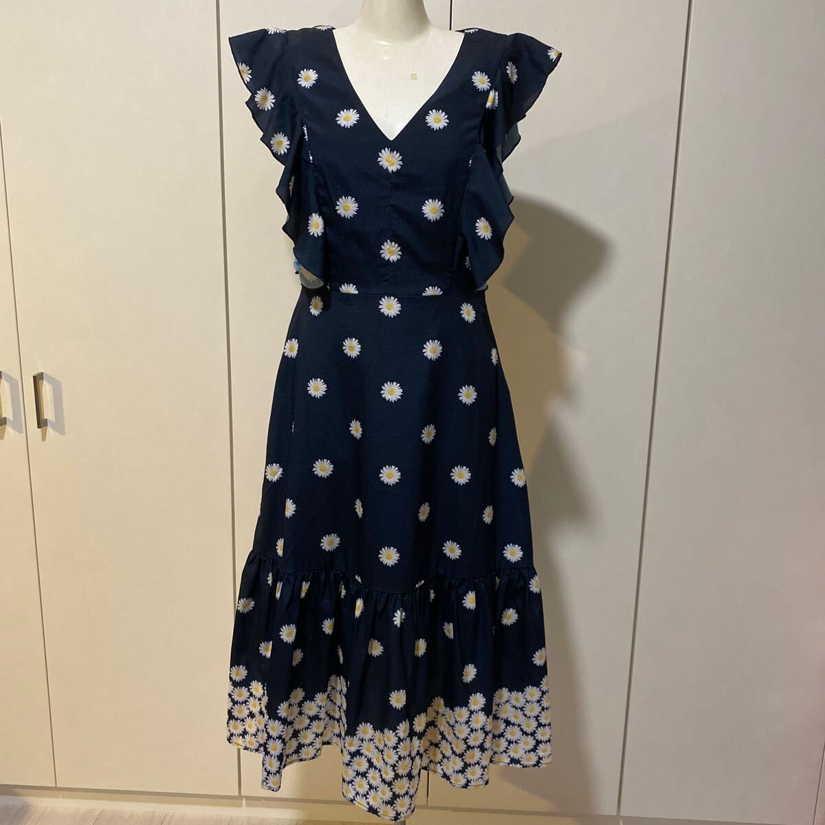 - 美品フリル花柄ロングワンピースSネイビー