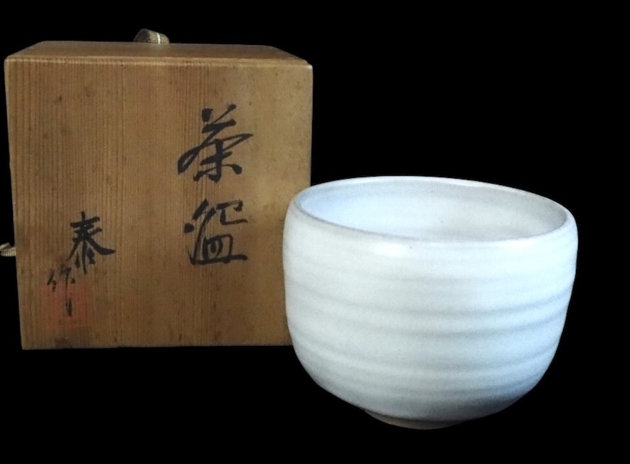> 手触りの良さと、釉の垂れ方が美しい!昭和ビンテージ 泰作 茶盆 抹茶茶碗 乳白釉 作家印有 茶道具 木箱付 1970〜1980年代 KYI607