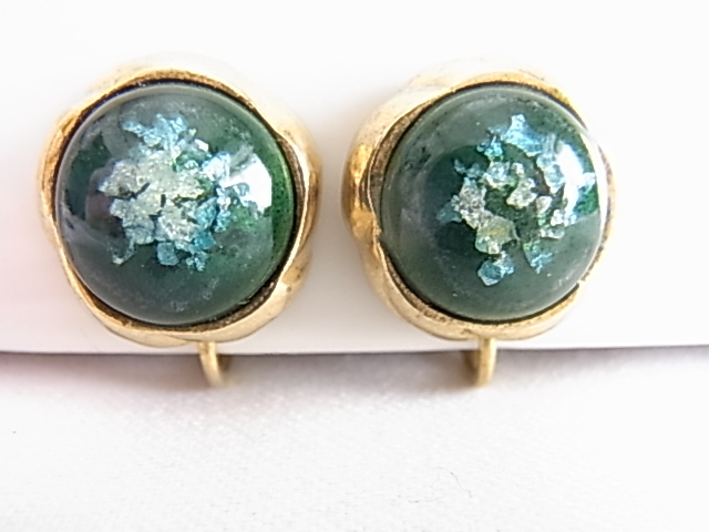 > ビンテージ/ヴィンテージ 和柄かものはいろ 鴨の羽色 緑 グリーントーンに柄模様 金色との2トーンが綺麗な昭和レトロのイヤリング♪