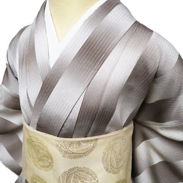 > 小紋 着物 未使用 正絹 袷 カジュアル 市松模様 点模様 反端付き 灰白色 錆利休色 身丈156.5cm 裄64.5cm M きもの北條 A1074-6