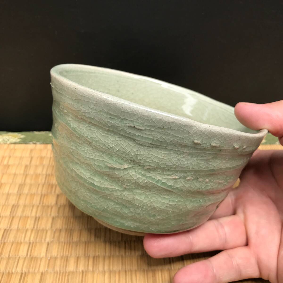 - 青磁貫入釉の大茶碗、岡部嶺男銘印?茶器 茶入 茶わん 小鉢 杯 珍味入れ(R60805_A)