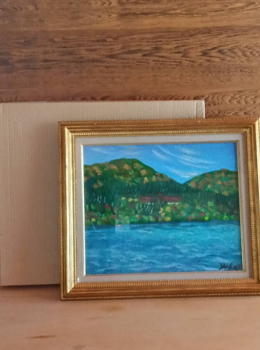 - 24081009 アンティーク風 油絵 作者不明 金縁 金彩 湖畔 湖 別荘 森 風景画 額縁