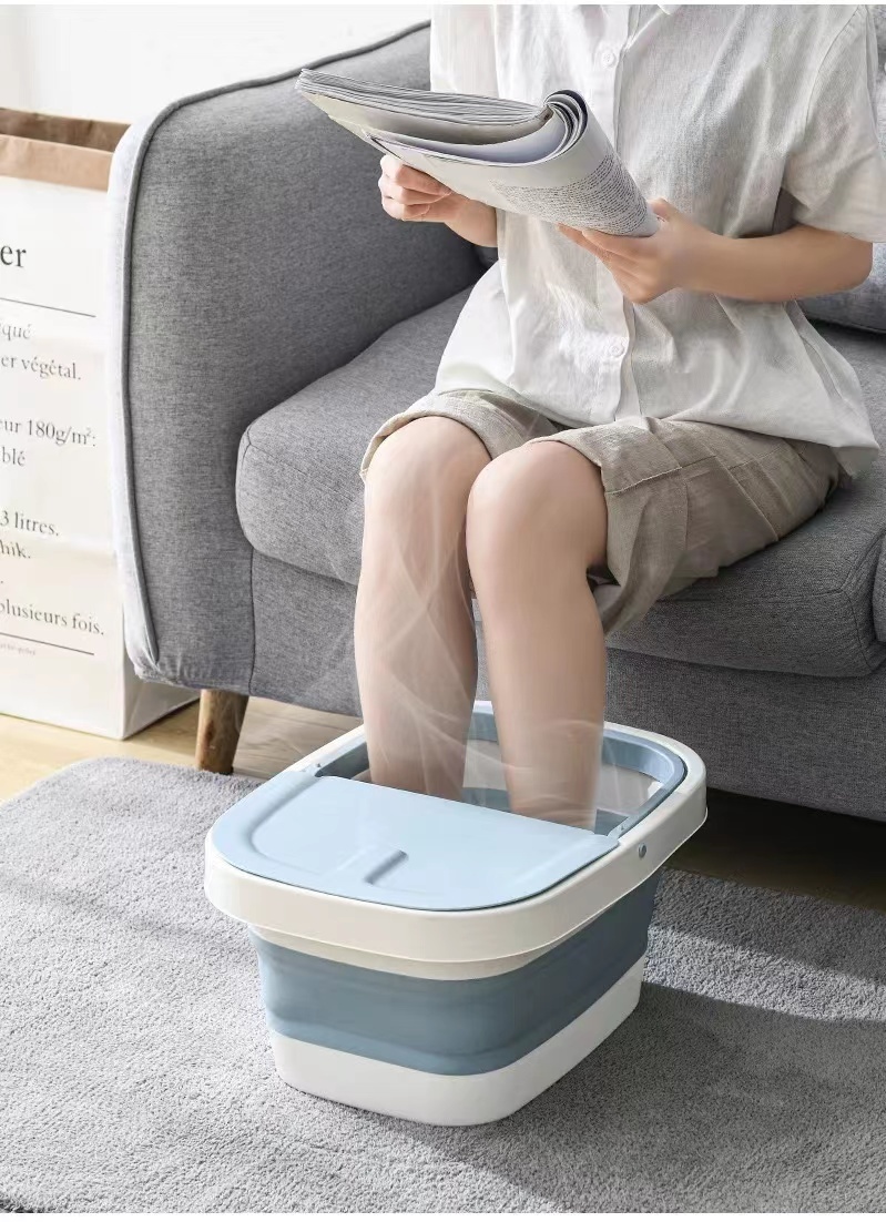 > ☆足湯 フットバス 自宅 バケツ 桶 深め 折り畳み式 防水 保温 蓋つき マッサージローラー フットバスボウル たらい コンパクト ブルー