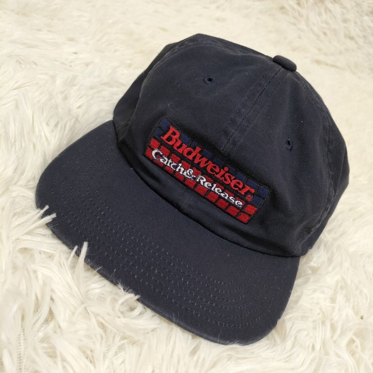 - 希少☆Budweiser 刺繍ロゴ フィッシングキャップ フリーサイズ ネイビー 紺色 帽子 ヴィンテージ オールド バドワイザー 企業系 古着 USED